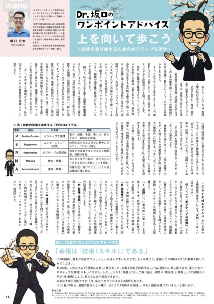 今、ちょうど医学生や研修医の皆さんは、国家試験という大きな山を越え、4月からの新体制に向けて大きなプレッシャーを感じている時期ではないでしょうか。もちろん、医療現場以外でも、春からの新生活を前に、多くの人が新たな一歩への不安を抱えているかもしれません。